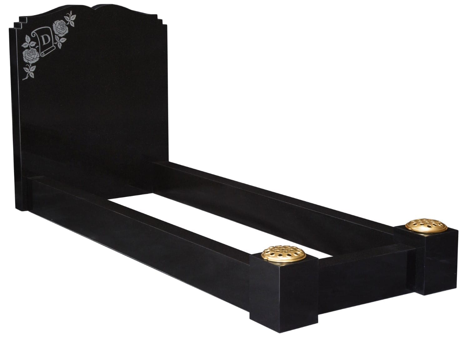 Elegant and strikingly shaped kerb set memorial with distinctive design elements. The WG113 features a sandblast scroll and rose motif, bringing artistic elegance to a dignified tribute. Available in various colours.