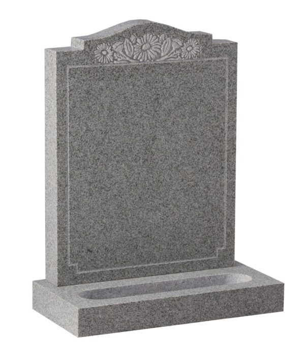 The WG176 Funeral Headstone features elegant deep sandblast daisies with a refined pin line and integrated planting trough. Crafted from premium Karin Grey granite, this dignified memorial offers a timeless tribute to your loved one.
