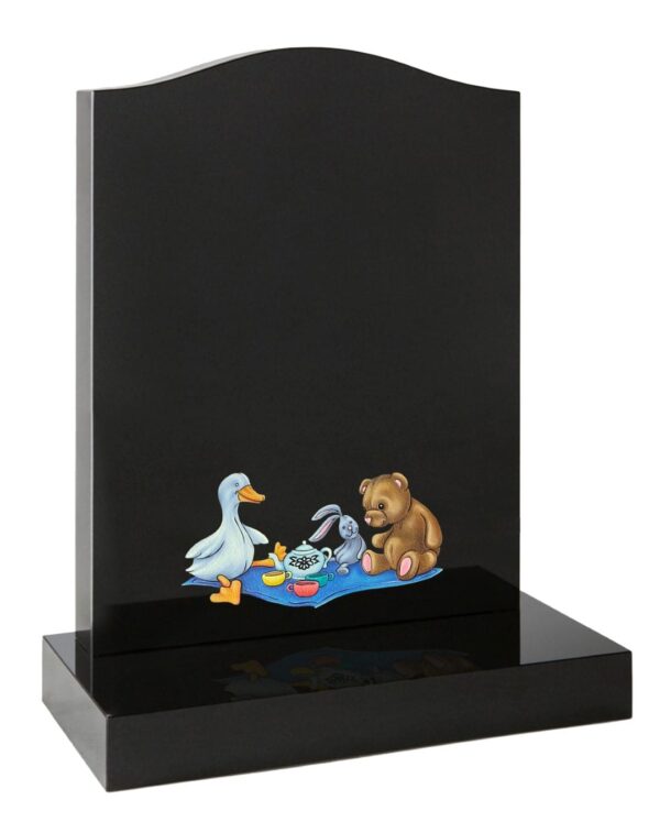 The WG236 Children's Memorial is a tender and artistic tribute designed to honour the memory of a cherished child. This memorial features an elegant ogee-shaped headstone adorned with a beautifully hand-painted scene of the Teddy Bear's Picnic, capturing the innocence and joy of childhood.