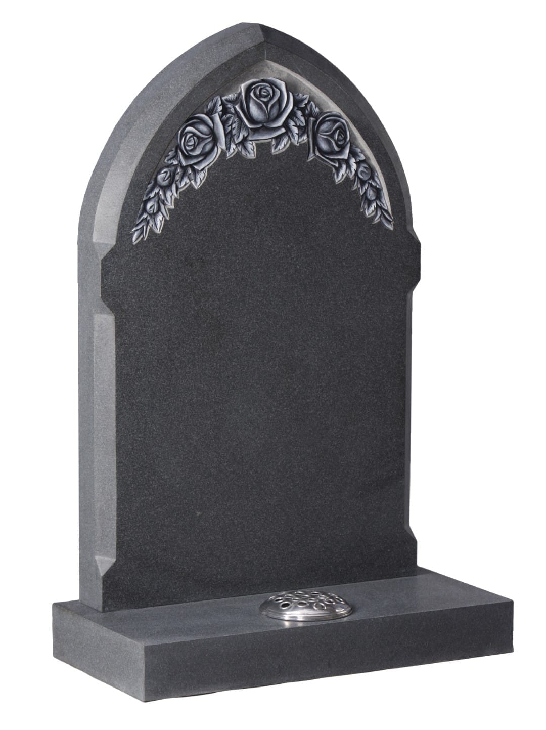 Each rose is meticulously highlighted to create a striking contrast against the honed granite background, adding depth and visual impact to this reverent memorial. The gothic shape brings a timeless elegance that speaks of tradition while honouring personal remembrance.